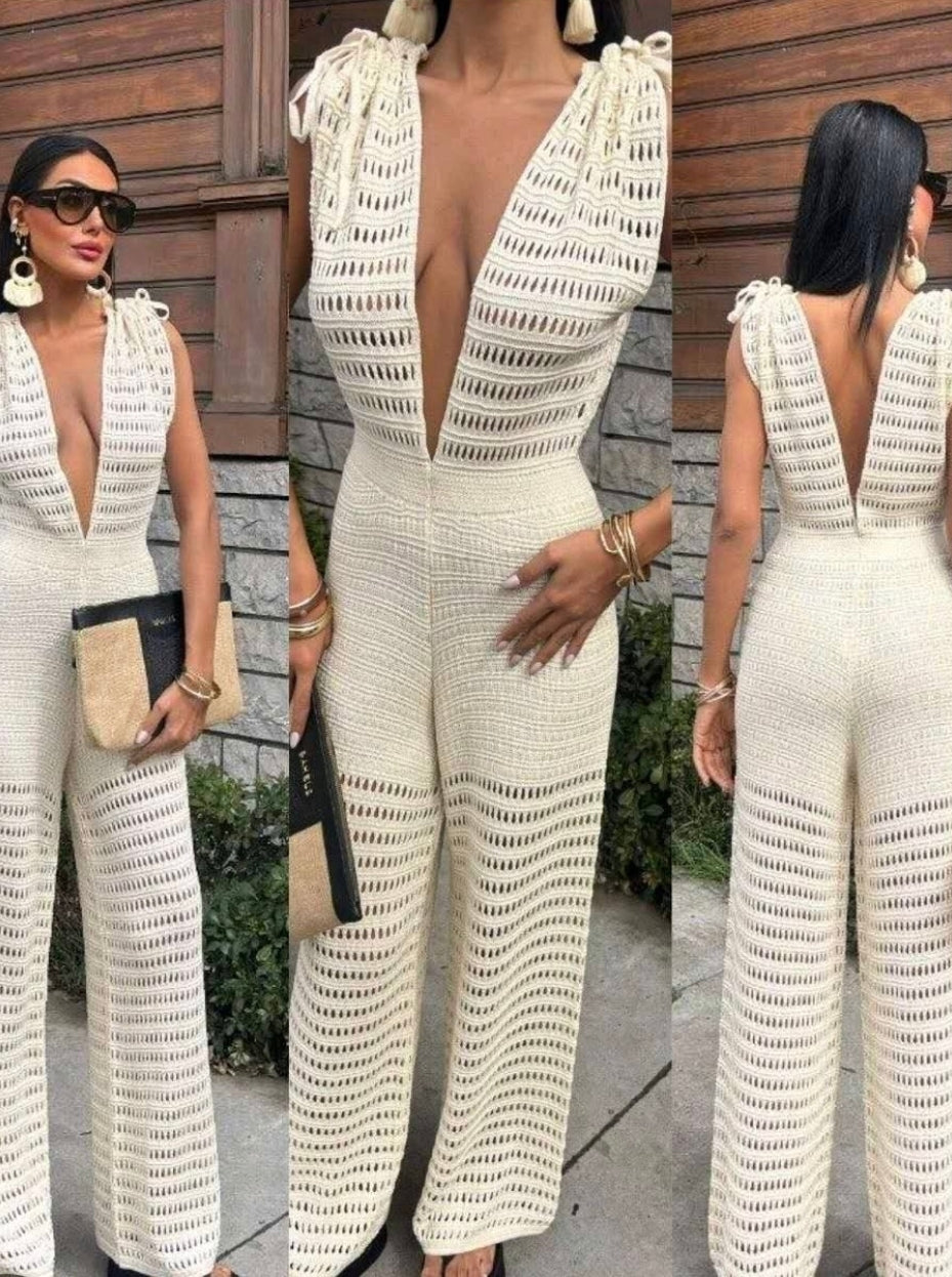 Este mono largo, confeccionado en un delicado tejido crochet calado, es la pieza perfecta para un look relajado pero impactante. Su escote en V y el diseño sin mangas ofrecen una frescura ideal para los días cálidos, mientras que el patrón calado crea un efecto visual ligero y atractivo. La pierna ancha proporciona una caída fluida y un movimiento elegante, ideal para un aire despreocupado y chic.