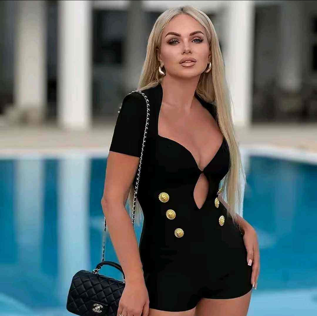 Mini mono de fiesta estilo blazer con escote corazón profundo y abertura central, doble botonadura dorada y cintura marcada que estiliza. Manga corta, pernera mini y crepé elástico para un ajuste cómodo. Cremallera invisible en la espalda y forro parcial. Ideal para cenas, eventos y noches de fiesta (Navidad y Nochevieja)