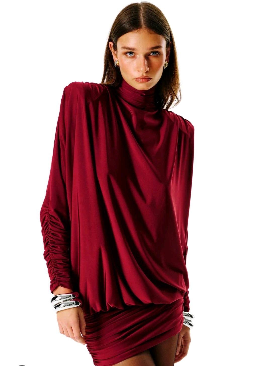Amalfi es un mini vestido con cuello alto, top efecto blusón y falda ceñida con frunces. Destaca su espalda abierta drapeada con cierre de botón al cuello. Tejido elástico y cómodo. Ideal para cenas, eventos y Nochevieja.