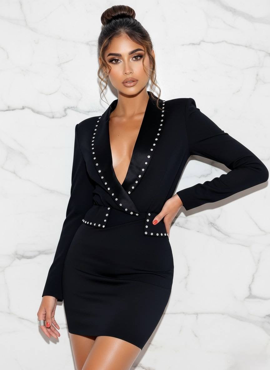 Brilla con elegancia. Verona es un mini vestido bodycon con escote en V y pedrería en escote y cintura. Manga larga, frunce sutil y tejido elástico que moldea sin marcar. Ideal para Navidad, cenas y Nochevieja.